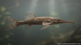 Farlowella acus is a small to medium-sized catfish native to tributaries and slow-moving rivers of South America. Its most distinctive feature is a remarkably elongated, flattened body with a narrow snout and a tail that resembles a twig. This camouflage helps the fish blend into submerged roots and plant matter in its natural environment.