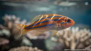 The Six Line Wrasse (Pseudocheilinus hexataenia) stands out in home aquariums for its bright orange body and striking pattern of six blue stripes. Energetic and alert, the fish tends to explore rockwork throughout the day, making it a favorite for reef tanks that value movement and color.